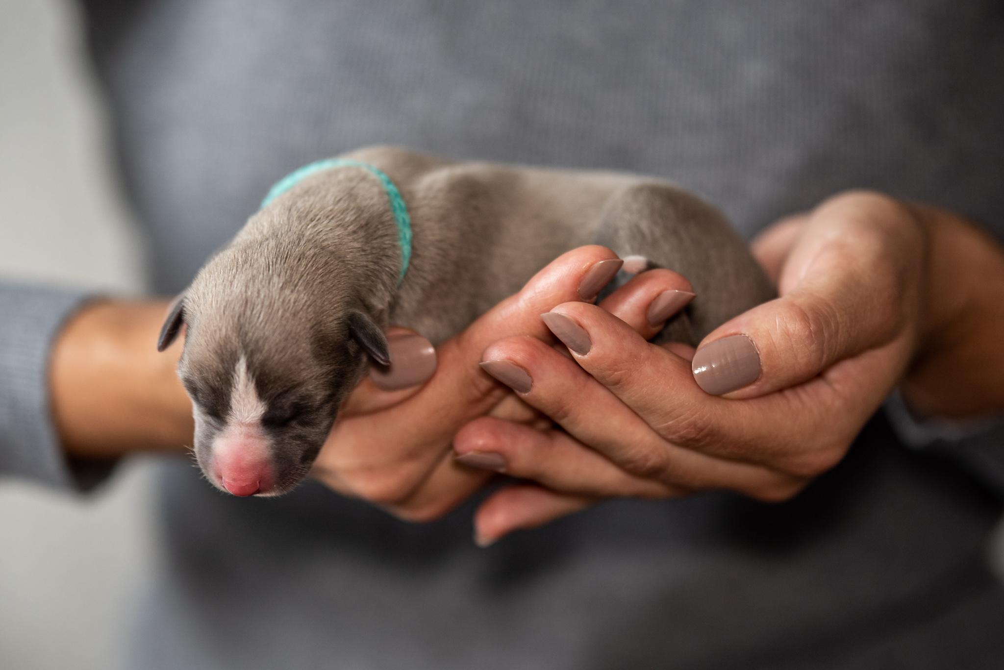 V čase 19:58 se narodil jako sedmé štěňátko první kluk. Zbarvením plavý s bílými znaky po tatínkovi Titovi. Porodní váhu má 352 g.